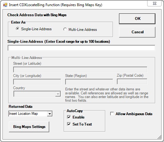 To use as a right-click function, right-click on any cell in a worksheet, select the Insert CDXLocateBing Function, and you will see the input box shown below: